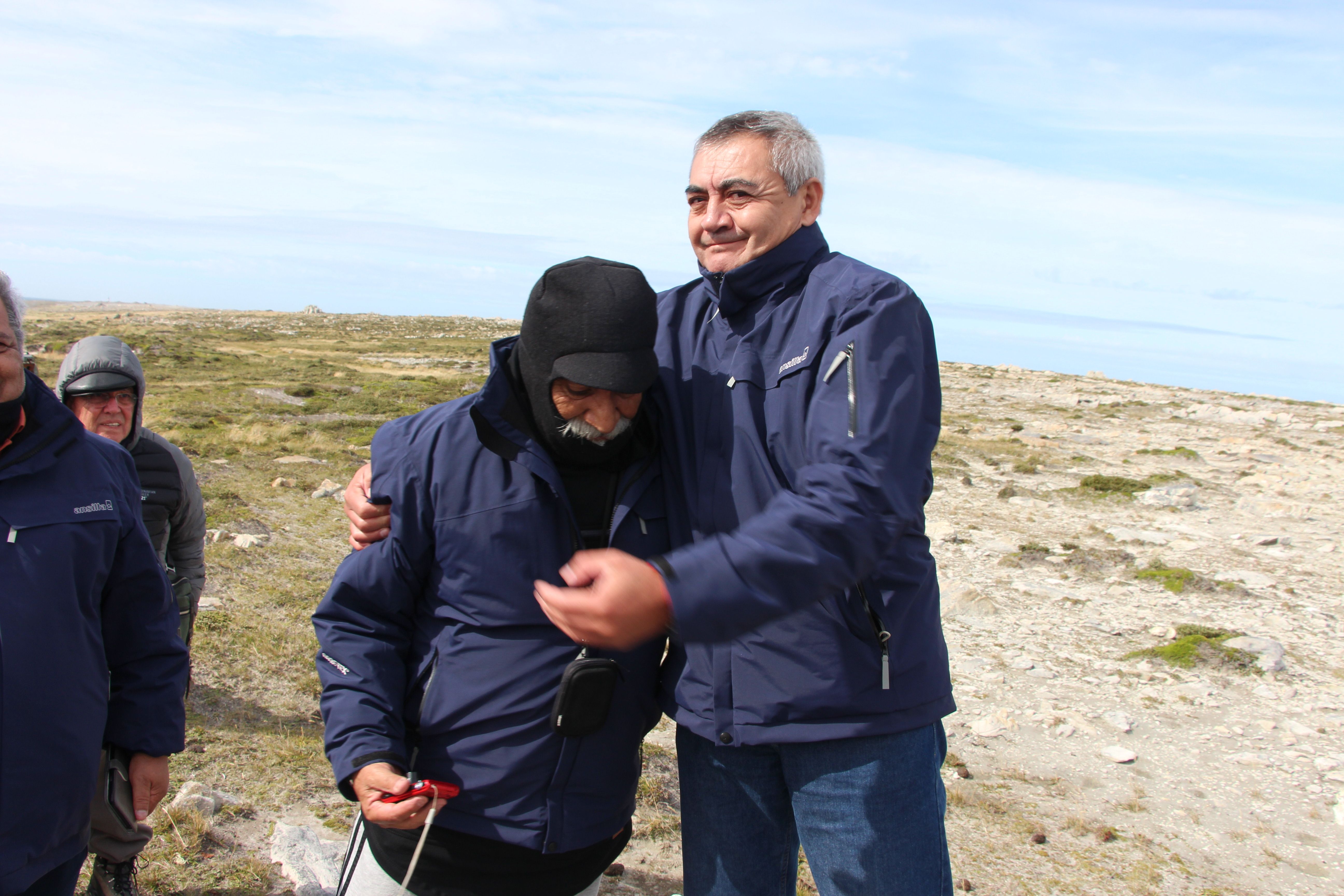 Unas piedras filosas amontonadas en forma de ‘U’. Están a unos 800 metros del viejo aeropuerto de Malvinas, en una zona elevada. Luis Roberto Alonso De Armiño, uno de los más veteranos del grupo de sanjuaninos, entra y se pone en posición de disparo, mirando al mar. Lo acompaña Carlos César Rubina. La escena dura un puñado de segundos, suficientes para quebrarse. Se funden en un abrazo. Es, a esta altura, el primer contacto de los excombatientes con la guerra. Un aplauso de los compañeros busca calmar el dolor. No alcanza, aquellos días están nuevamente en sus mentes y se percibe en el ánimo.
