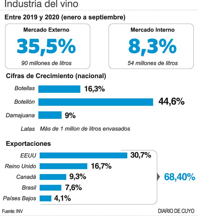 Lo cierto es que, durante la pandemia, al vino le fue mejor que a las otras bebidas, según revela un informe de IES Consultores. Y es porque el sector vitivinícola logró diferenciarse del resto de las bebidas al exhibir un notable repunte en el mercado interno, que es acompañado por una fuerte expansión en las exportaciones en volúmenes, porque el tipo de cambio competitivo impulsó la actividad exportadora en general y permitió recuperar el mercado de líneas de vinos masivas. En el caso del mercado interno, según datos del Instituto Nacional de Vitivinicultura (INV), durante el mes de octubre los despachos al superaron los 83 millones de litros con un crecimiento del 1,3% con igual mes del año anterior. Los vinos sin mención varietal representaron el 65,9% del total, los varietales el 29,7% y los espumosos el 3,9% y otros vinos el 0,5%. De este modo, el acumulado de los primeros 10 primeros meses de este año totalizó los 791.247.100 litros. Con estas cifras ya se superó en más de 54 millones de litros a igual periodo de 2019.