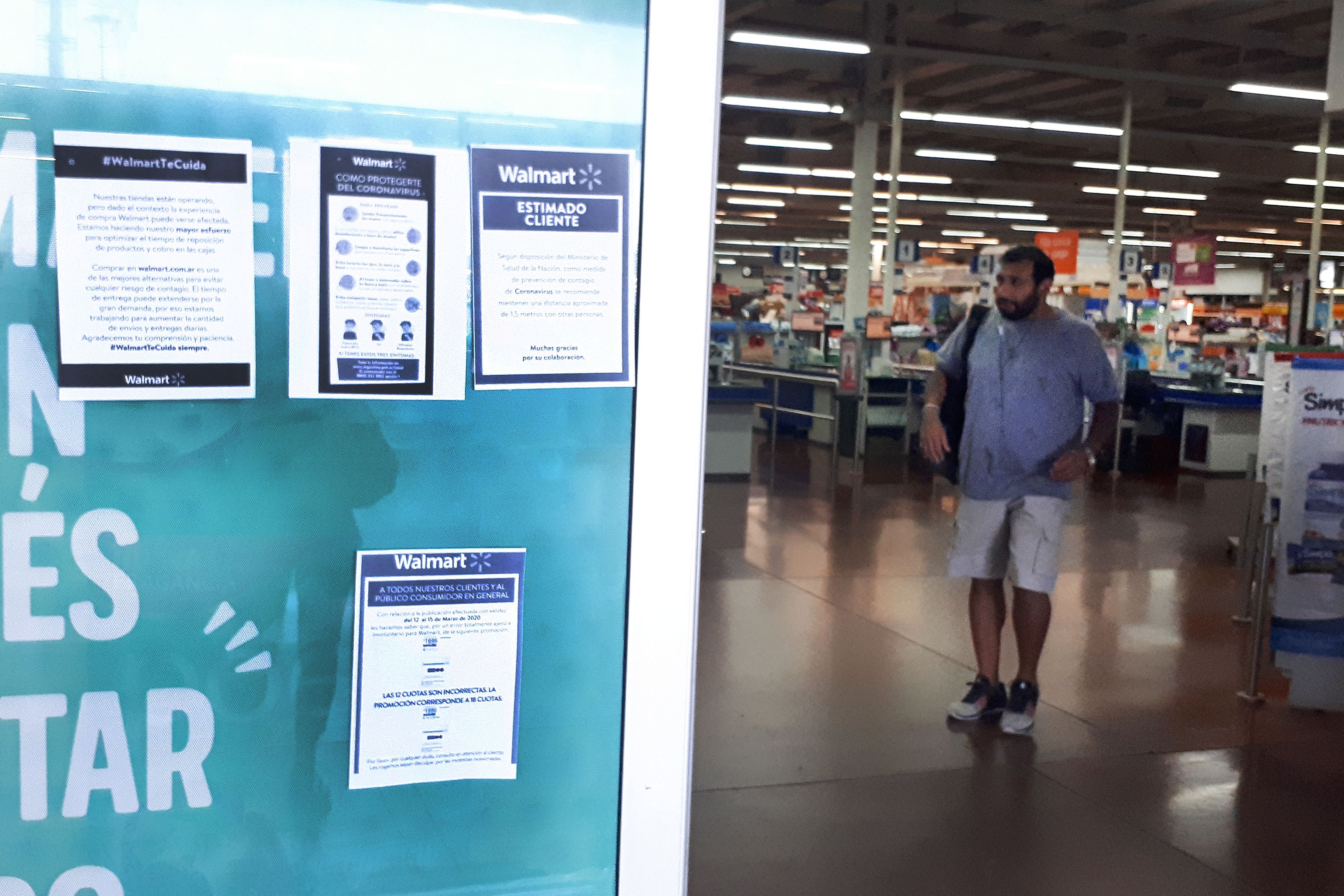 Por su parte, Walmart tiene cartelería que indica las recomendaciones para prevenirse del contagio de coronavirus y recomienda a sus clientes mantener una distancia aproximada de 1,5 metros con otras personas mientras realizan las compras.