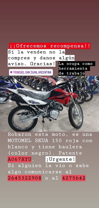 Se trata de una Motomel Skua 150 roja con blanco y baulera negra. Si alguien vio algo comunicarse al 264 532-2908.