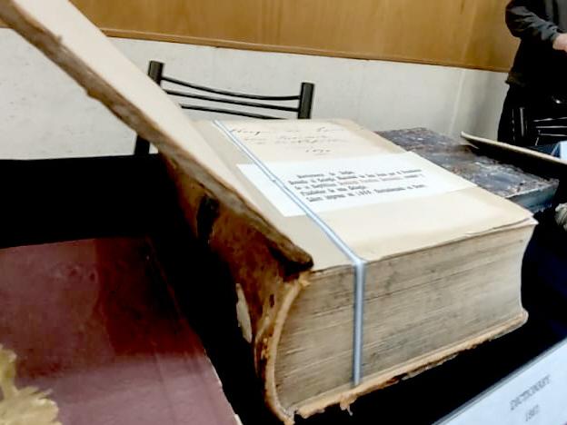 Están exhibidos algunos de los ejemplares más emblemáticos de la biblioteca del Colegio Nacional. Y sin dudas que uno de ellos es el diccionario que Sarmiento le donó a la escuela en 1870, cuando el prócer sanjuanino era presidente.