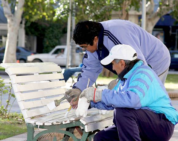 Una de las primeras tareas que ya hicieron, dijo Ferrero, fue la de limpiar la fuente. Para realizar esa actividad usaron ácido muriático. Con ese químico fue posible remover los restos de sarro y las leyendas escritas con pintura en aerosol en los azulejos. Otro de los trabajos tuvo que ver con el tratamiento de los árboles que rodean la plaza. Estos tenían huecos en los costados que estaban expuestos al estacionamiento de autos, que se fueron haciendo con el tiempo por el roce de los mismos. Esas partes dañadas fueron estudiadas por la Subsecretaría de Medio Ambiente y rellenadas con una mezcla (usada en estos casos para darle mayor resistencia a la planta) compuesta por fungicidas, cemento y ripio.