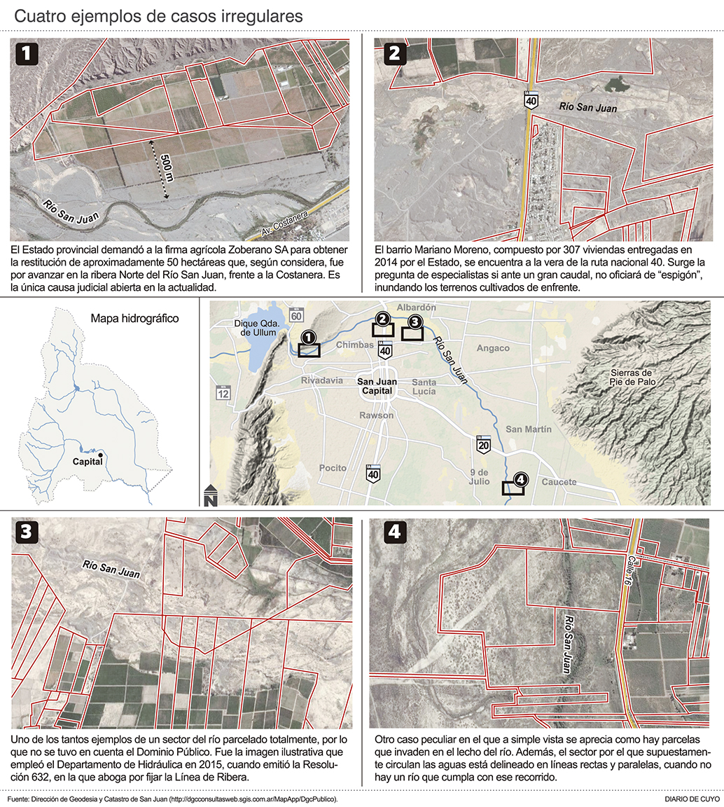 San Juan es un caso más entre las provincias que carecen de esta reglamentación. Y al faltar la Línea de Ribera fueron sucediendo varios problemas. Entre los más llamativos figuran la demanda que el Estado realizó a una empresa agrícola por considerar que avanzó más de la cuenta (50 hectáreas aproximadamente) con sus cultivos; la posibilidad que invadió el Dominio Público el barrio Mariano Moreno (ver Página 12); la causa judicial "Nacional Lead" en la que unos particulares pretendían llevar a remate público un gran inmueble en zona cordillerana, con ríos y arroyos incluidos, y la Provincia tuvo que presentar un freno judicial ante la Corte de Justicia de la Nación. También hay hechos de menor magnitud pero particularmente paradójicos, como un productor ganadero que podría estar obligado a detener un emprendimiento en Marayes porque no fue advertido oportunamente que se instalaba en tierras públicas (ver Página 11).