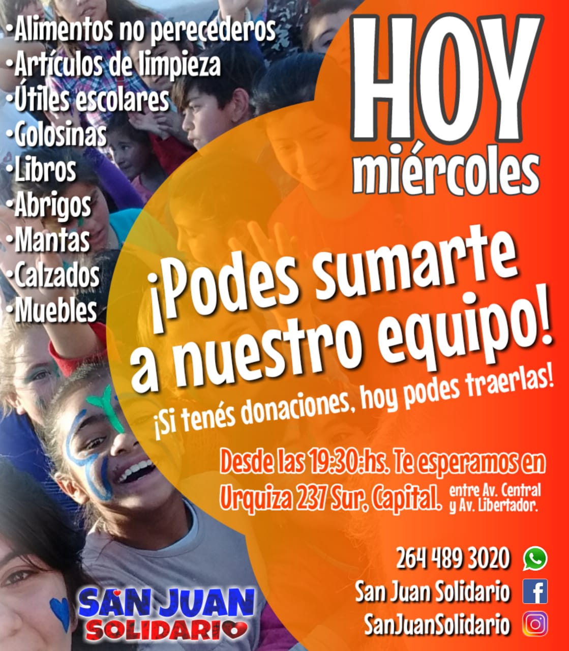 La recepción de donaciones se realizará en el Salón Apel, de calle Urquiza 237 Sur entre Av. Ignacio de la Roza y Libertador, este miércoles entre las 19 y las 21:30.