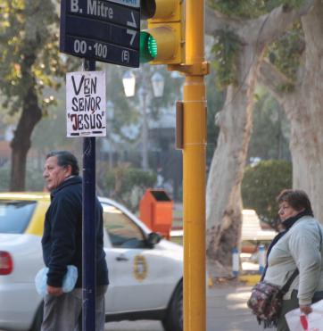’Jesús es la vida’ y ’Ven señor Jesús’, son algunos de los mensajes que aparecieron pegados en los semáforos y postes de los carteles con los nombres de calles en el centro. Y si bien nadie sabe quién los puso, desde la Municipalidad de la Capital dijeron que los van a sacar porque eso no está permitido.