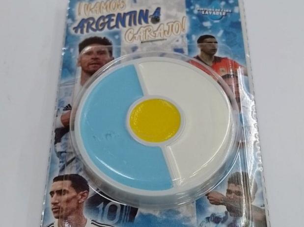 El maquillaje celeste y blanco es otro de los productos más vendidos. Hay de diferentes tamaños y formas. En algunos locales hay labiales que pintan celeste y blanco a la vez. Las pinturitas para la cara cuestan desde $200.