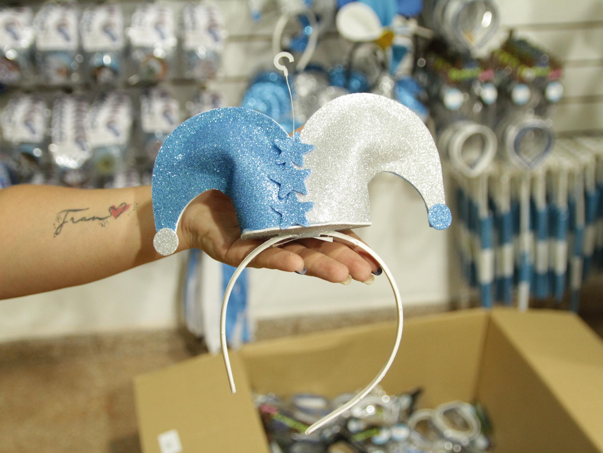 Las vinchas con distintas decoraciones celestes y blancas son furor. Hay con lentejuelas, corazones y flores. Sin embargo, las más pedidas son las que tienen una corona brillante o un sombrero de arlequín. Cuestan desde $300.
