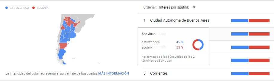 En cuanto a las vacunas, San Juan fue una de las pocas provincias en las que las búsquedas se enfocaron en Sputnik y no Astrazeneca, con 55%.