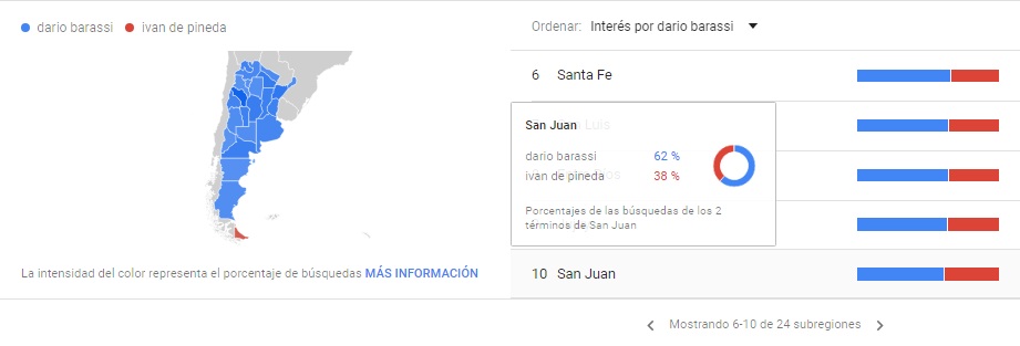 El gran año del sanjuanino conduciendo "cien argentinos dicen" se vio reflejado también en Google. Es que salvo en Tierra del Fuego, en el resto del país fue más buscado que Iván de Pineda, cabeza visible de "Pasapalabra". En la provincia, se quedó con el 62% de las búsquedas totales. Curiosamente, fue en La Rioja donde la diferencia se agigantó, con el 90% a favor del también actor.