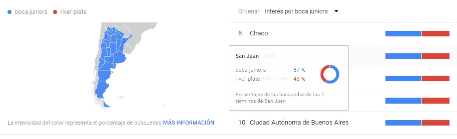 En términos de búsqueda, el Xeneize arrasó en el país. En todas las provincias el término "Boca Juniors" fue más consultado que "River Plate". En San Juan, el porcentaje fue 57 a 43 a favor del conjunto de la Ribera.