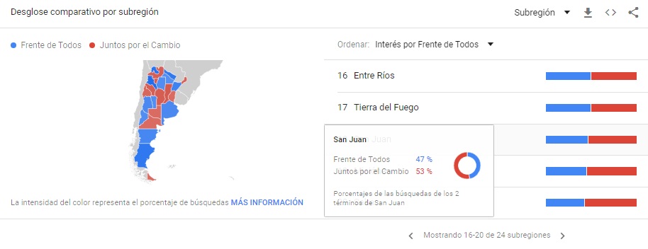 En cuanto a termino de búsquedas, el "Frente de Todos" y "Juntos por el Cambio" polarizaron, una vez más, el país. En la provincia, el macrismo tuvo mayor cantidad de cliks, con el 53%.