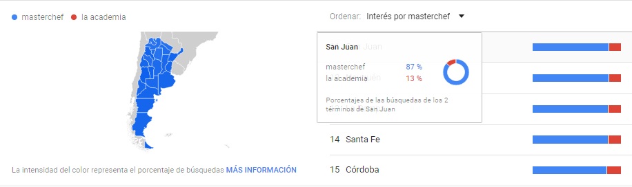 Tal como ocurrió en el rating de todo el año, en Google también arrasó el programa de cocina. El país completo se inclinó por el ciclo de Telefe. En San Juan, la diferencia fue más que amplia. El 87% buscó Masterchef, y el resto se inclinó por Tinelli y cía.