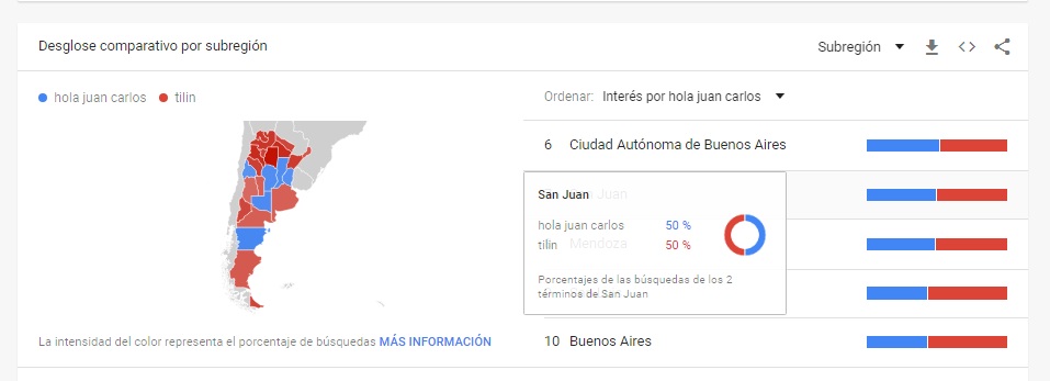 Los dos virales más escuchados a lo largo del 2021 también tuvieron su lugar en Google Trends. Quizás aquellos que intentaban saber el origen de los videos o simplemente para verlos una y otra vez. Por un lado "Hola Juan Carlos", por el otro "eso Tilín, dale Tilín, guau Tilín". En San Juan hubo empate técnico con un 50% para cada uno. En el resto del país, la mayoría se inclinó por el simpático nene bailarín.