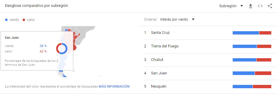 Sin lugar a dudas, una de las grandes incógnitas que tienen los sanjuaninos es si va a soplar viento, Zonda o Sur indistintamente, o cuánto calor va a hacer. En 2021, el viento se llevó gran parte de las miradas, con el 58% de las búsquedas.