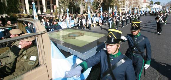 Los colores patrios, que colgaban de cada rincón de la ciudad, hicieron que el día se viviera como una verdadera fiesta. La gente esperó ansiosa para conocer y fotografiar la bandera que pasó rápidamente, pero que dejó los pechos inflados de orgullo por ser sanjuaninos. A las 11,40 la bandera comenzó su salida del Museo de Bellas Artes Franklin Rawson. Escoltada por los granaderos, militares del RIM 22, del Ejército 8, el Ejército 11 y Uspallata, la insignia fue la dueña de las miradas. Es que el gran despliegue hizo que el mini desfile se viviera con una intensidad única. Trasladada por 4 efectivos del RIM 22 fue colocada sobre un Jeep. A paso de hombre fue mostrada al pueblo mientras que los acordes de la Banda de Música hacían eco en las paredes del Centro Cívico y contagiaba respeto por la insignia.