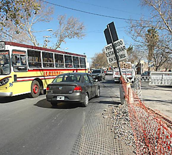 De un lado están las mallas de plástico, tachos de aceite pintados de naranja, señalizaciones y las zanjas de más de 50 centímetros de profundidad de la media calzada que espera ser pavimentada. Del otro lado está la peligrosa y transitada otra media calzada de la avenida Libertador. Y en el medio de todo ese revuelo, está la improvisada parada de colectivos para ir hacia el Oeste. Allí, a escasos centímetros de cientos de vehículos que pasan a toda velocidad, adultos y niños (que van a las escuelas del Barrio Camus) levantan sus brazos para parar los micros de las dos líneas que pasan por el lugar.