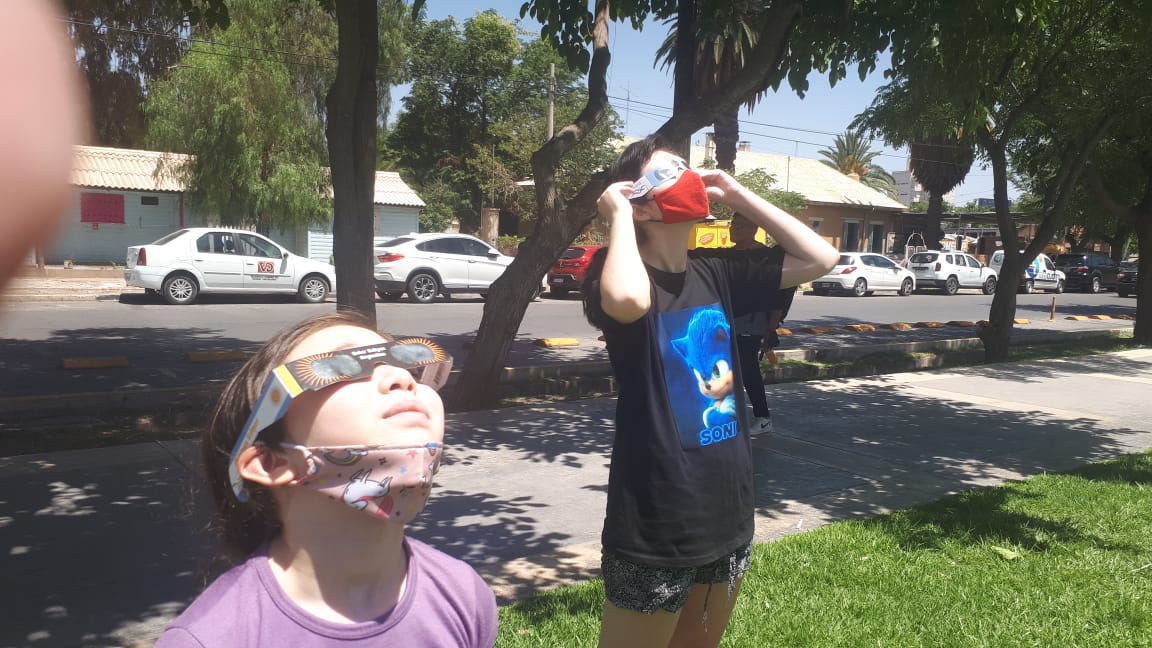 La postal de las familia Valdéz distrutando del eclipse no fue una imágen común, como lo fue en el eclipse del año pasado, pocos sanjuaninos se concentraron este medio día para presenciar el fenómeno astronómico en diferentes puntos de la provincia.