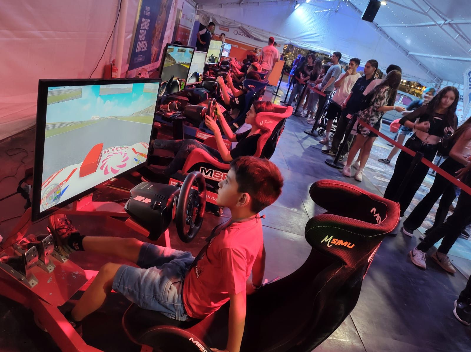 Además, en el stand el público puede disfrutar de diferentes sectores destinados a juegos, música, sorteos, ritmos urbanos y zumba. Mientras que también hay simuladores para hacer carreras en línea. Los competidores, en su mayoría niños y jóvenes, hacen largas filas para poder jugar y llevarse premios.