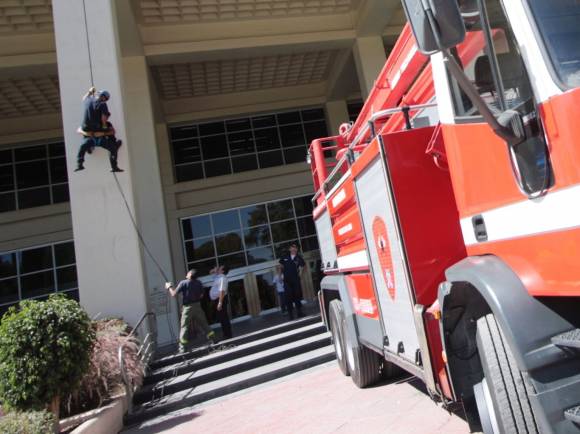 Primero la autobomba se estacionó en uno de los accesos laterales del Centro Cívico. Algunos bomberos comenzaron a bajar corriendo para ingresar al edificio, mientras otros trepaban por la escalera de la movilidad. De a poco fueron accediendo a todos los niveles de altura. Y para ensayar el rescate que harán mañana, uno de ellos bajó por una cuerda desde una ventana, sujetando a un compañero que hacía las veces de víctima lesionada e imposibilitada de moverse.