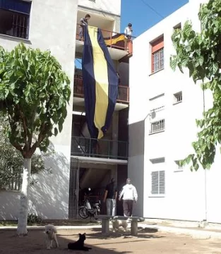 "Muchos de los chicos del grupo están desocupados y el barrio estaba muy sucio", dijo Daniel Martínez, presidente de la agrupación, mientras señalaba las paredes del complejo que aún no pintan y que están llenas de letras y dibujos hechos con aerosoles de distintos colores. Y contó que "se nos ocurrió pedir a empresarios hinchas de Boca que nos vendieran más barato pintura, brochas, cepillos, rodillos, y todo lo que necesitábamos para pintar las paredes de los departamentos". Luego les informaron la iniciativa a los vecinos y dijeron que, el que quisiera que le pintaran el frente del departamento, debería pagarles, pero a un precio más barato del que cobra normalmente un pintor. "Se produjo como un efecto dominó: pintamos el de Luis, ya el cura que vive en uno de los departamentos quiso que pintáramos el suyo, después el vecino del cura, y el otro, y así se fueron sumando", contó Martínez, con la bandera azul y oro que colgaron al lado de las paredes limpias, de fondo.