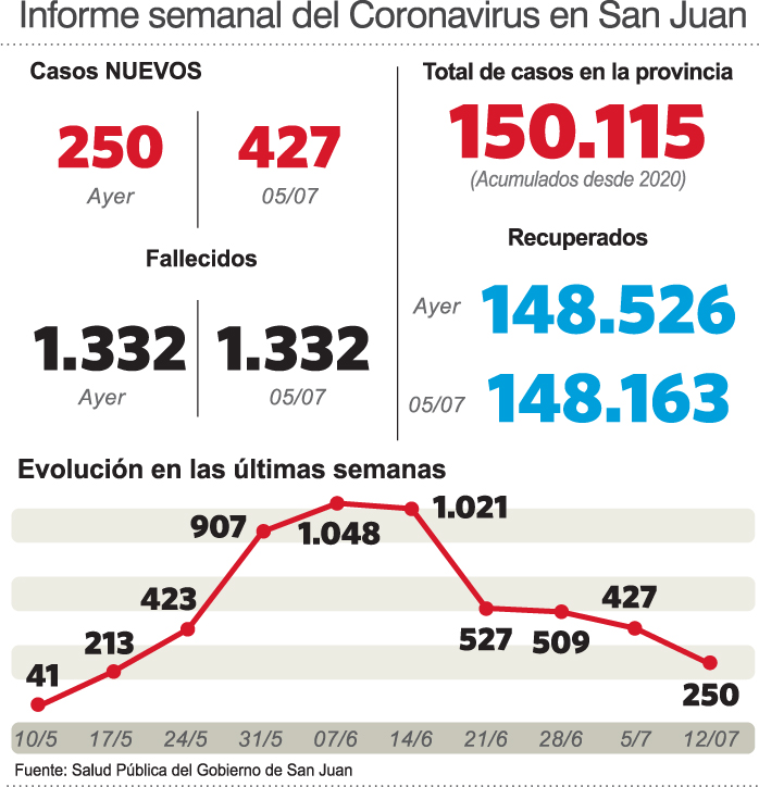 Ayer se dio a conocer un nuevo reporte sobre covid en San Juan y se mantiene una tendencia alentadora. Por quinta semana consecutiva los casos siguen en baja. Según los datos oficiales de ayer, hubo 250 nuevos casos, es decir un 41% menos de contagios que la semana anterior, cuando fueron 427. Sin embargo, desde Salud pidieron a la gente que no se relaje para evitar un rebrote. La situación sanitaria en la provincia va a contramano de lo que sucede a nivel nacional, donde se ha registrado un importante aumento de contagios en las últimas dos semanas y algunos especialistas ya hablan de una nueva ola.
