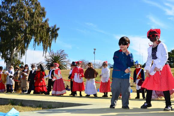 Tras cantar el Himno Nacional, apareció Zamba, el personaje de la serie de la TV Pública, representado por un alumno de primero que fue el encargado de guiar el repaso por la historia que arrancó y terminó con baile.