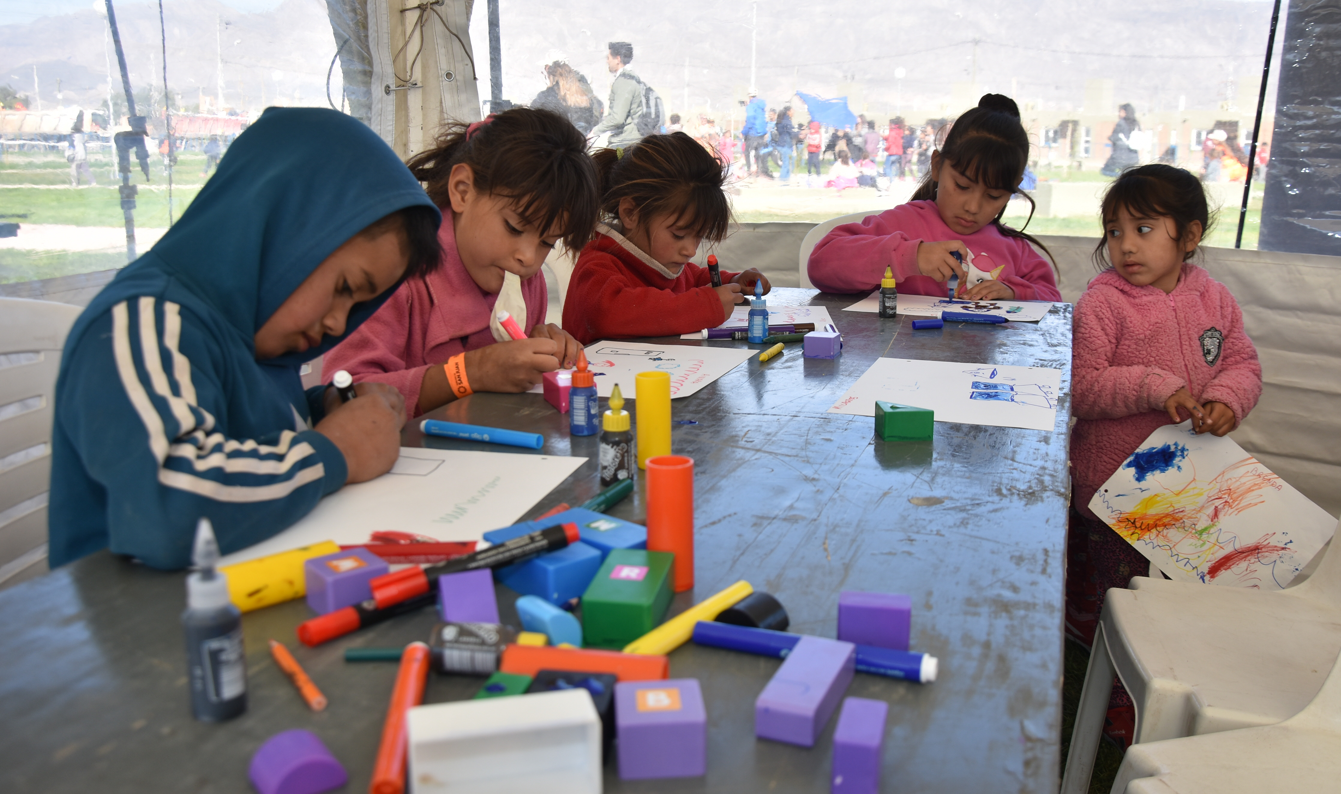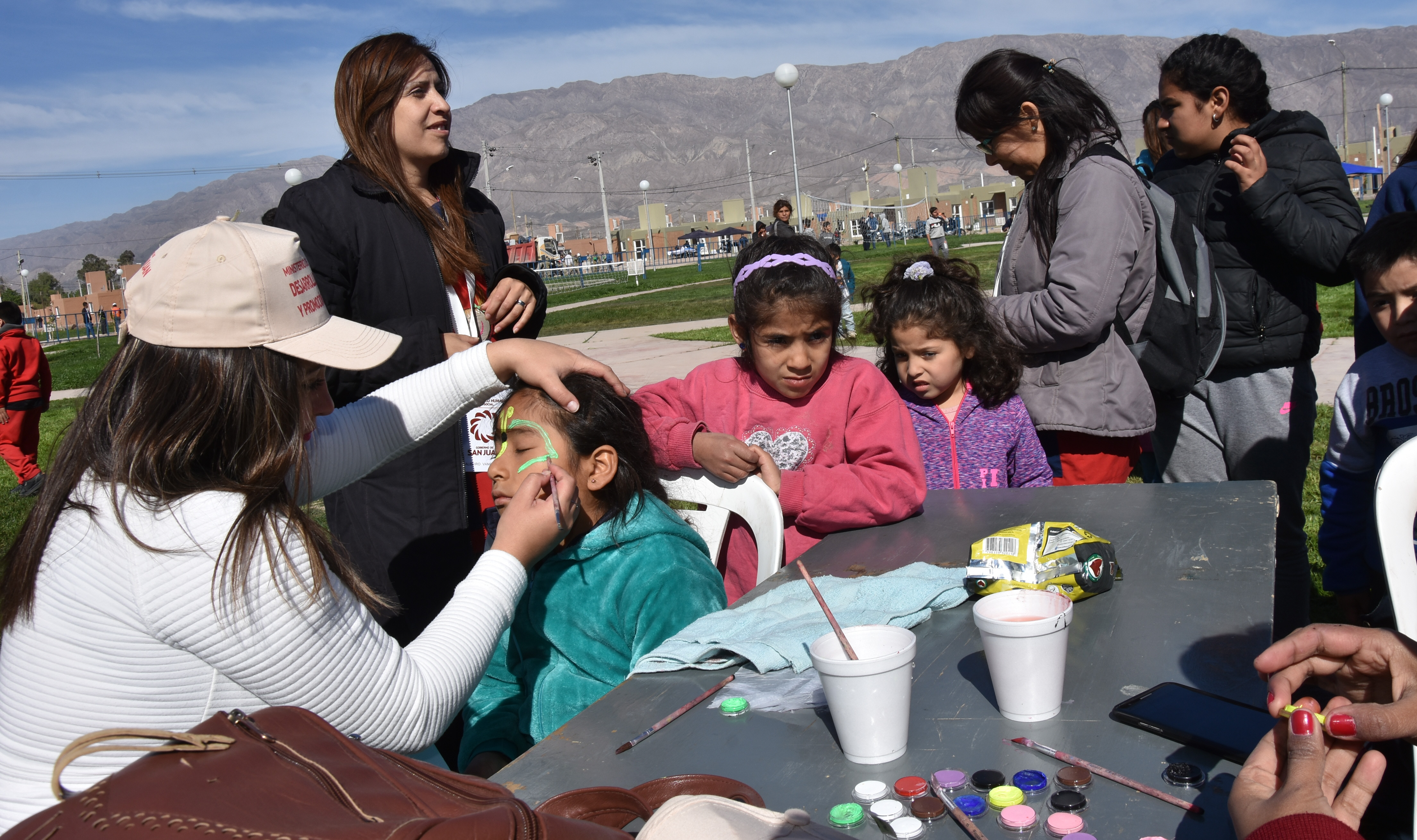 Ni bien llegaron a la plaza del Barrio Cruce de Los Andes 1 y 2, y tras tomar un desayuno nutritivo con leche y budín, los niños comenzaron con el circuito de la diversión. Las nenas eligieron primero hacer fila en el stand del maquillaje artístico para que les pintaran la cara, mientras que los varones coparon las canchas de vóley y fútbol que improvisaron en el lugar. Y los más chiquitos prefirieron quedarse dentro de una de las carpas armando castillos con los ladrillitos o dibujando. Pero hubo una actividad a la que la mayoría se sumó: el baile.