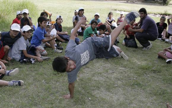Muchos ya se conocen y saben quiénes pueden brindarles un espectáculo. Llaman a Agustín y le gritan que haga la vertical. El niño se para en el centro de la ronda y, mientras sus compañeros aplauden, deja ver sus destrezas.