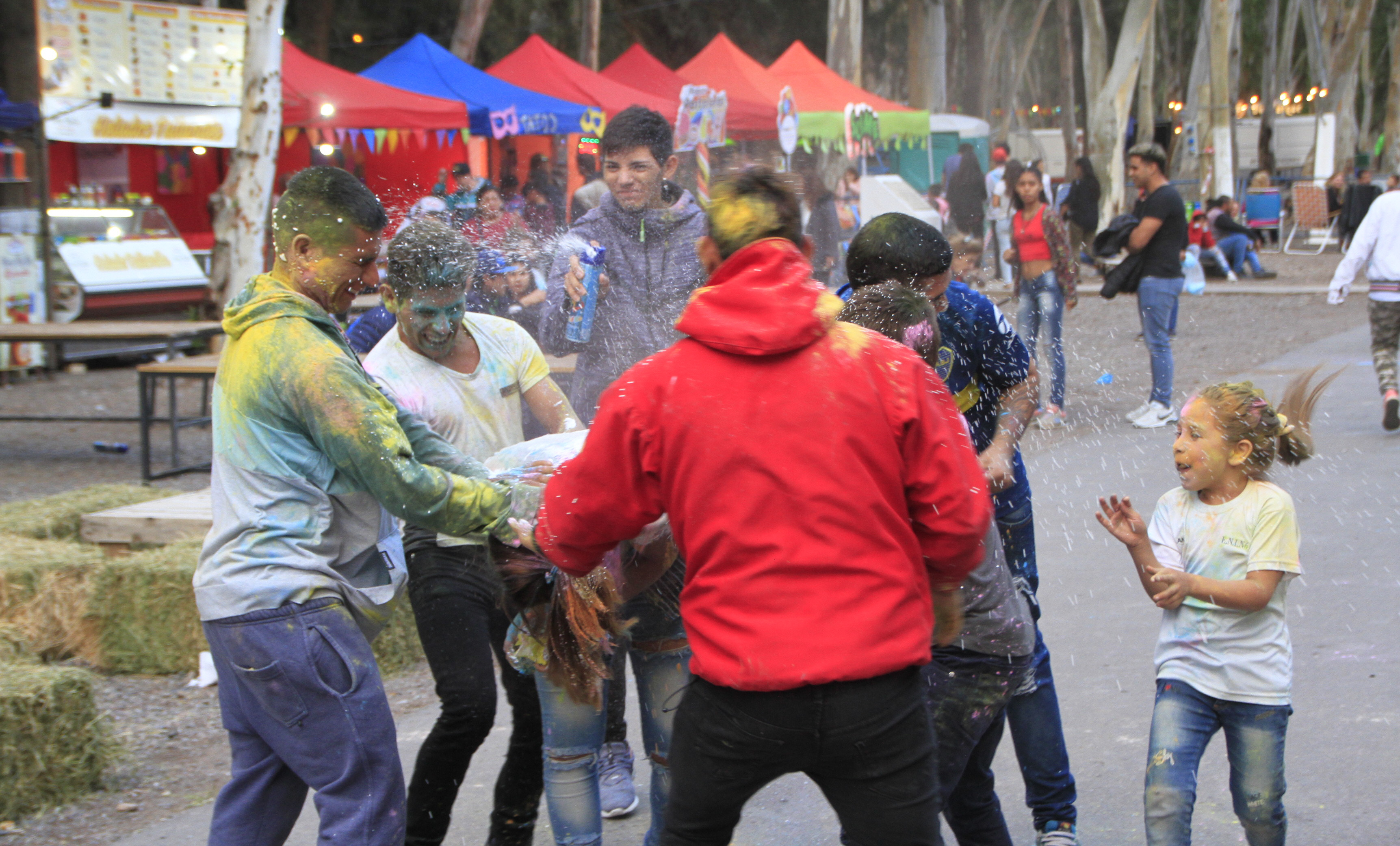 Hacía media hora de la apertura del predio y el suelo parecía un arcoíris. Es que los chicos ni bien ingresaron comenzaron a chayar con los polvos de colores. Y contagiaron la diversión a los más grandes. En algunos momentos, familias completas participaron de esta actividad, pero con un plus. A los polvos de colores le sumaron nieve artificial, instalando un verdadero clima de carnaval.