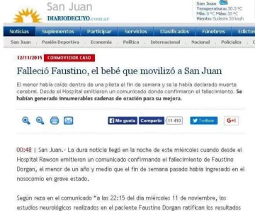 Desde el año pasado, en San Juan hubo 5 casos que marcaron tendencia en las redes. La historia de Coti Mulet, la joven que pidió desesperadamente ayuda para ser operada en EEUU porque padecía Anemia de Fanconi, fue uno de estos casos. Este año hubo más historias que causaron explosiones en la web. Valentino Grossi (10 meses), conmovió hasta fuera de la provincia porque su prótesis no ingresaba al país, Nicolás Bartolomé, el hijo de los integrantes del Dúo Mixtura, falleció en un accidente doméstico y las cadenas de oración y el pésame se viralizaron rápidamente, al igual que en el caso de Faustino Dorgan, el bebé de 1 año que cayó a una pileta y falleció. La creación de un facebook para conseguir padrinos y madrinas para hacer regalos para la próxima Navidad, también fue furor. Según el sociólogo Marcelo Tardy y el psicólogo, Gabriel Martínez, este fenómeno se da porque la sociedad tiene la necesidad de exponer sus problemas y considera que a través de la web puede conseguir una respuesta más inmediata.