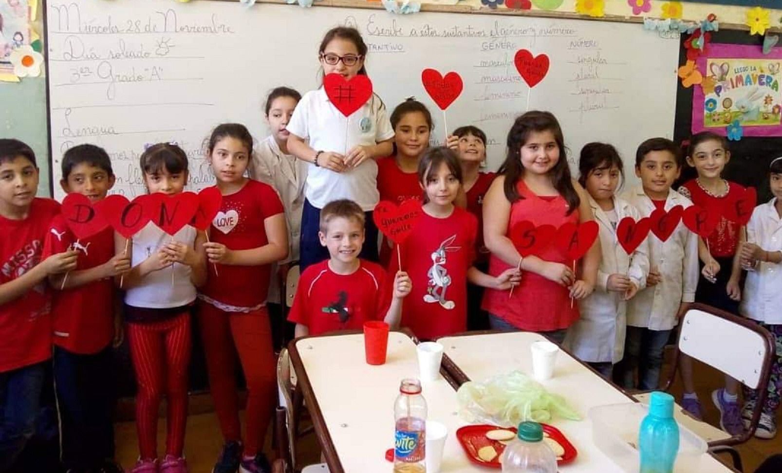 La niña llegó a la escuela como cualquier otro día, aunque un poco más nerviosa porque tenía una integrativa. Participó, junto a sus compañeros del izamiento de la bandera y luego su mamá habló ante los chicos sobre la importancia de la donación de sangre. Luego la nena entró al aula y se llevó una gran sorpresa. "Las mamás de la escuela llevaron a sus hijos con remeras rojas y los niños hicieron carteles con corazones que decían "Doná Sangre"", dijo Hebe Castillo, la mamá de Guille, como todos la conocen.