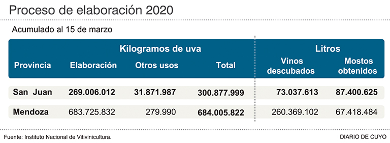 Según el INV ya se han cosechado poco más de 300 millones de kilos (ver infografía) en la provincia, y de acuerdo a la merma estimada par este año, restan aun levantar alrededor de un 25% más. En las entidades estiman que el grueso de lo que se iba a terminar a fines de marzo podrá extenderse una o dos semanas. "A todos nos agarró de sorpresa y estimo que tenemos toda la semana que viene y buena parte de la siguiente para poder terminar", dijo Pablo Martín, desde la Mesa Vitícola. Agregó que la mayoría de la gente se traslada en movilidades propias porque vive cerca de la finca y se le ha recomendado que no se junten. Por su parte Eduardo Garcés, titular de la Federación; mencionó que algunas zonas pueden demorarse porque no se permite el traslado de cosechadores en camiones, sino que deben hacerlo por sus propios medios y sin compartir las bicicletas o motos. Por su parte, el vicepresidente del INV, Hugo Carmona, admitió que se ha licenciado al personal de riesgo y se trabaja con guardias mínimas y on line desde la casa, además de 3 o 4 personas en laboratorio. Pero sostuvo que si hay demoras "se solucionan lo más rápido posible". El organismo se ocupa de controlar movimientos vinicos, la inscripción de registros y en las muestras de aptitud para autorizar exportaciones.