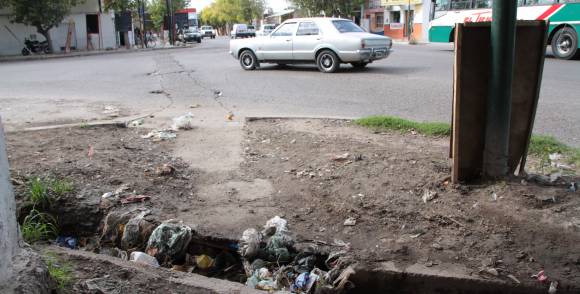 El agua que inunda casi toda la calzada y la basura que se amontona en las veredas y en los cordones de la calle, son una postal cotidiana en la esquina de República del Líbano y Paula Albarracín de Sarmiento.