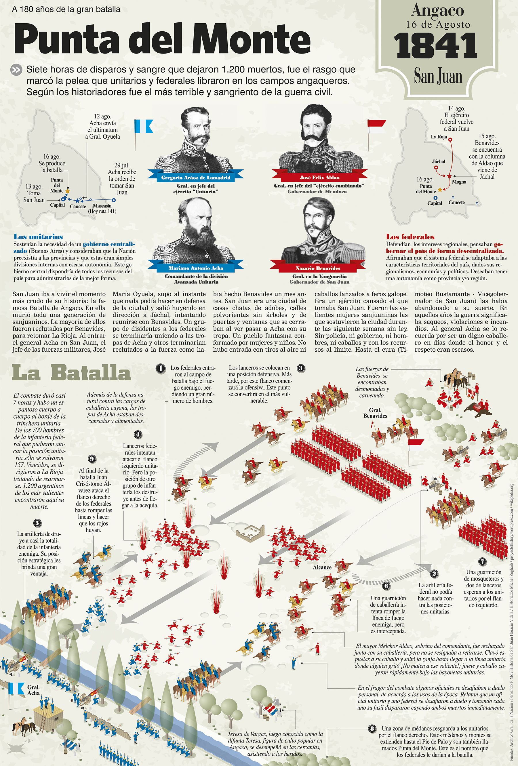 Hace exactamente 180 años, las tropas unitarias lideradas por el general Mariano Acha chocaban con el ejército federal del gobernador Nazario Benavídez, en la denominada Batalla de Angaco. Fue no sólo el enfrentamiento más sangriento en la historia sanjuanina, con un saldo de casi 1.200 muertos, sino que además le sucedieron casi de inmediato otros dos hechos similares y con los mismos protagonistas. A Angaco le siguió La Chacarilla, el 18 de agosto, y el 22 finalizó ese capítulo durísimo, que los historiadores terminaron bautizando como "La semana negra" de 1841. A partir de hoy DIARIO DE CUYO realiza tres entregas, con las fechas de las efemérides correspondientes (16, 18 y 22 de agosto), con un profundo desarrollo periodístico a través de infografías que reconstruyen aquella semana negra. La primera de esas infografías explica todos los detalles de la Batalla de Angaco (ver página 7) y se suma en esta edición la opinión del historiador Guillermo Genini.