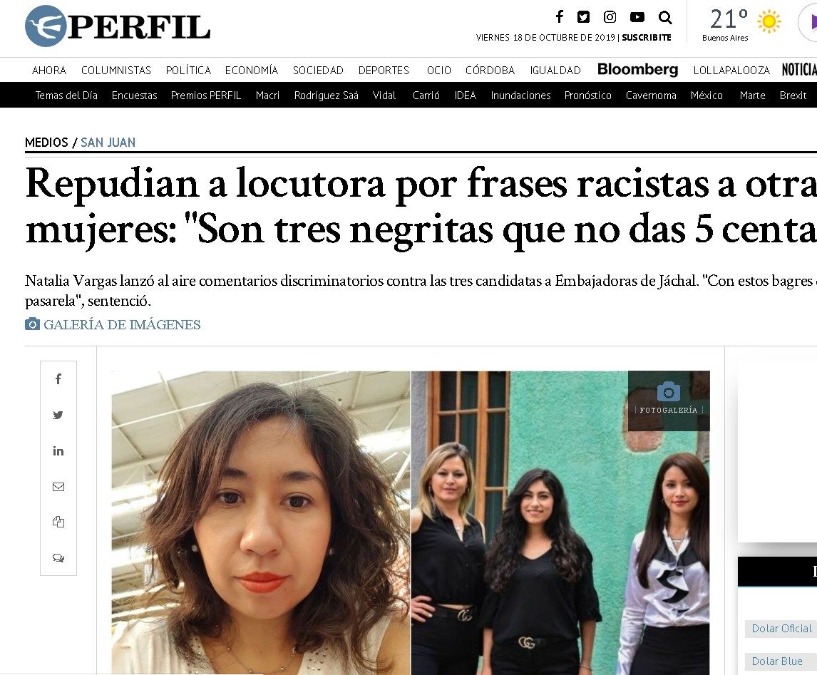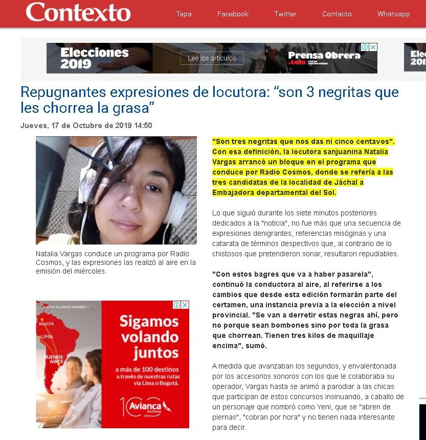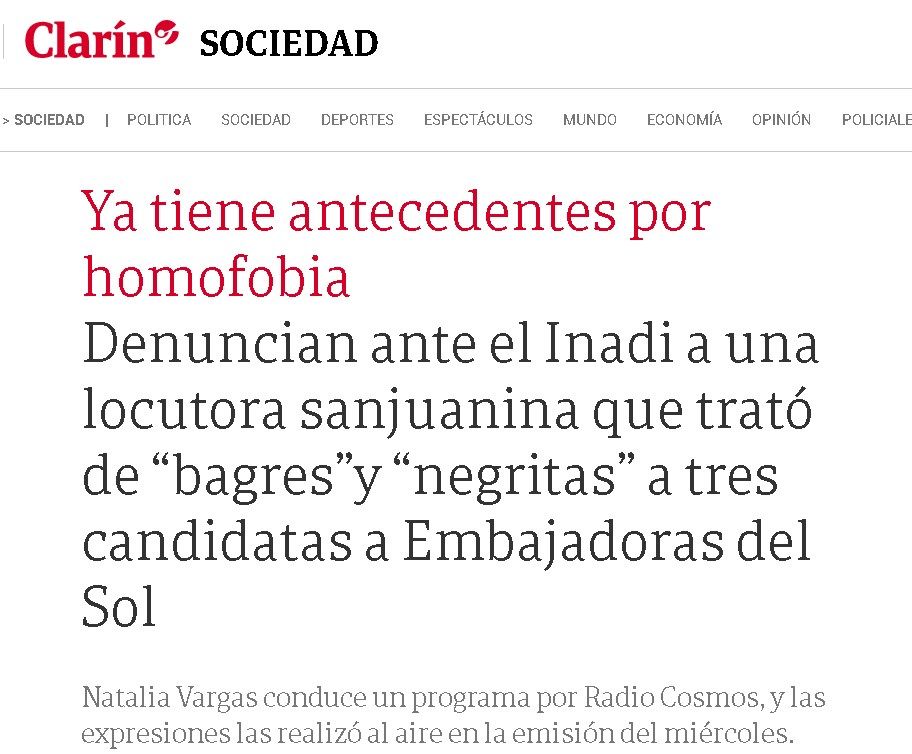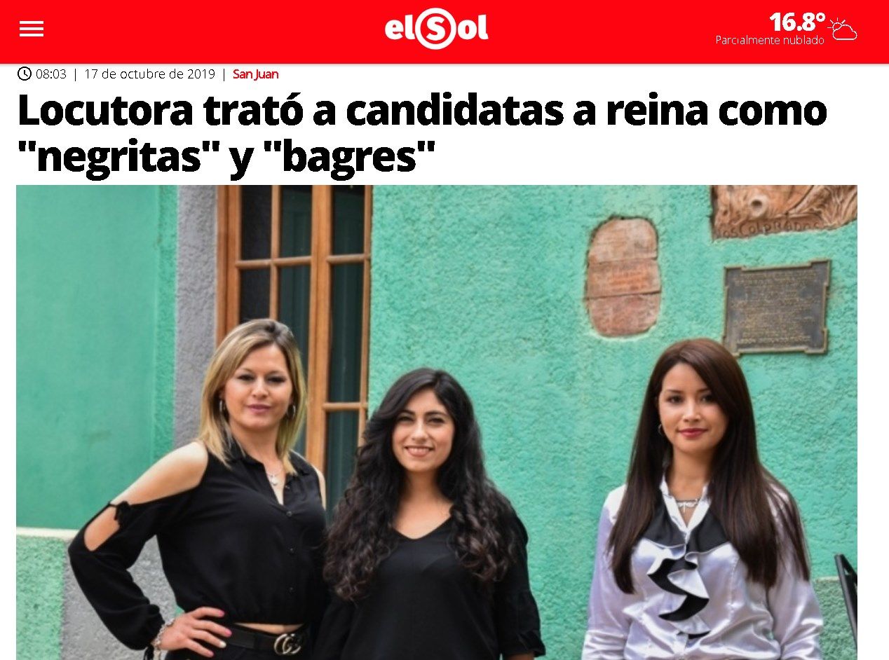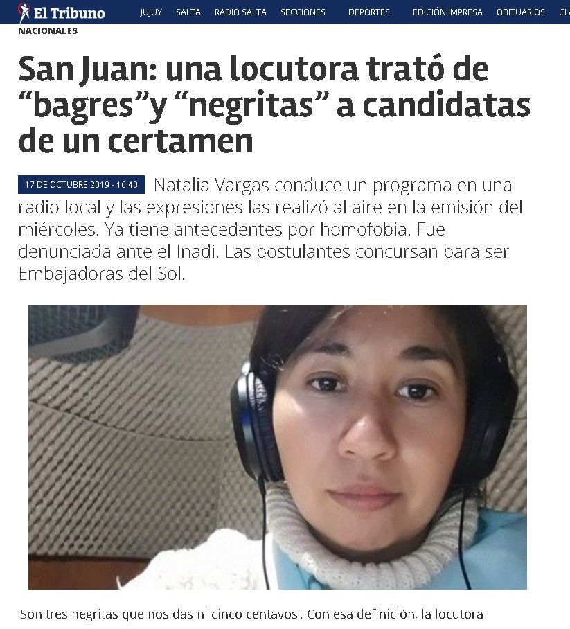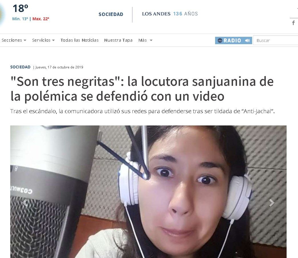 El escándalo desatado por Natalia Vargas sigue levantando polvareda. Es que en las últimas horas, medios digitales de todo el país se hicieron eco de los dichos de la locutora sanjuanina, quien había manifestado en su programa radial que las candidatas a Embajadora del Sol por Jáchal eran "tres negritas que nos das ni cinco centavos", además de tildarlas de "bagres" y asegurar que "se van a derretir, pero no porque sean bombones sino por toda la grasa que chorrean".