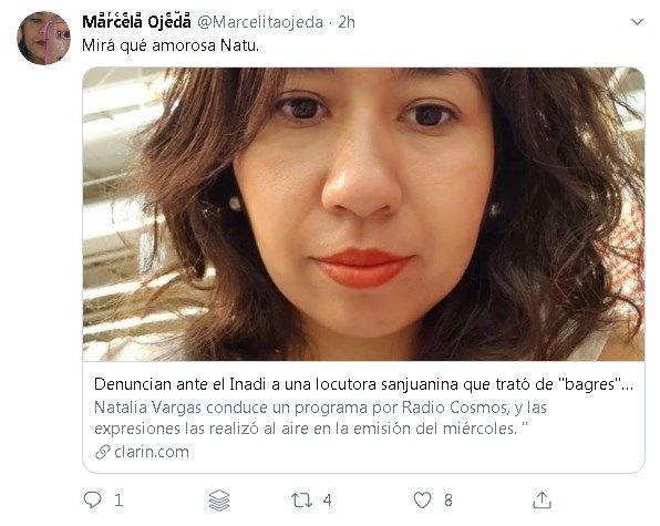 Incluso, la impulsora del "Ni una menos", Marcela Ojeda, se refirió al tema en su cuenta de Twitter. "Mirá qué amorosa Natu", escribió en forma irónica.