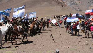 San Juan, 12 de febrero.- Esta mañana, los 151 expedicionarios del Cruce de los Andes (eran 152 pero Julio César Arredondo tuvo que ser bajado en helicóptero por un golpe de su mula, ver nota relacionada) llegaron por décima vez al límite con Chile y homenajearon, junto a sus pares chilenos, a la gesta libertadora del General San Martín.