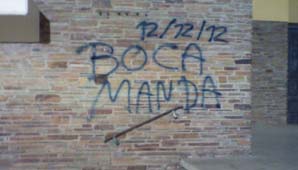Tras las detenciones que realizó la policía, los papelitos sueltos, botellas tiradas, sobras de bengalas, se pudo visualizar una inscripción que decía “BOCA MANDA 12-12-12” realizada con aerosol azul en el frente de la Catedral.