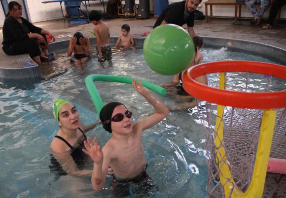 ‘Al aliviar la gravedad en el agua, reducimos el riesgo de impacto en las articulaciones. En cada clase hacemos ejercicios terapéuticos, dinámicos, sin esfuerzos. Con los más chicos, a eso lo convertimos en juegos. Pero además, les enseñamos a nadar, por lo que es un trabajo integral’, contó la kinesióloga Carla Deguer.