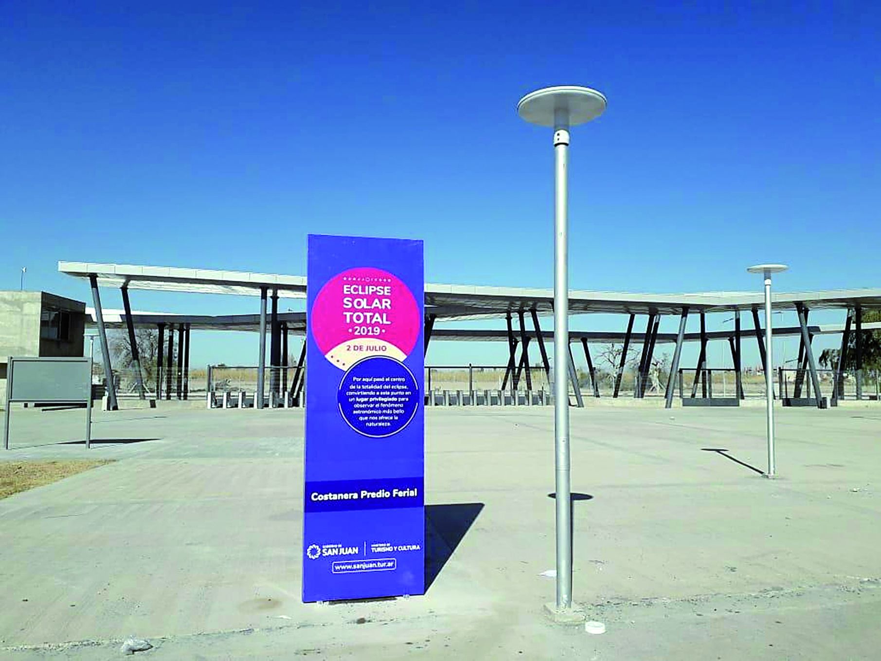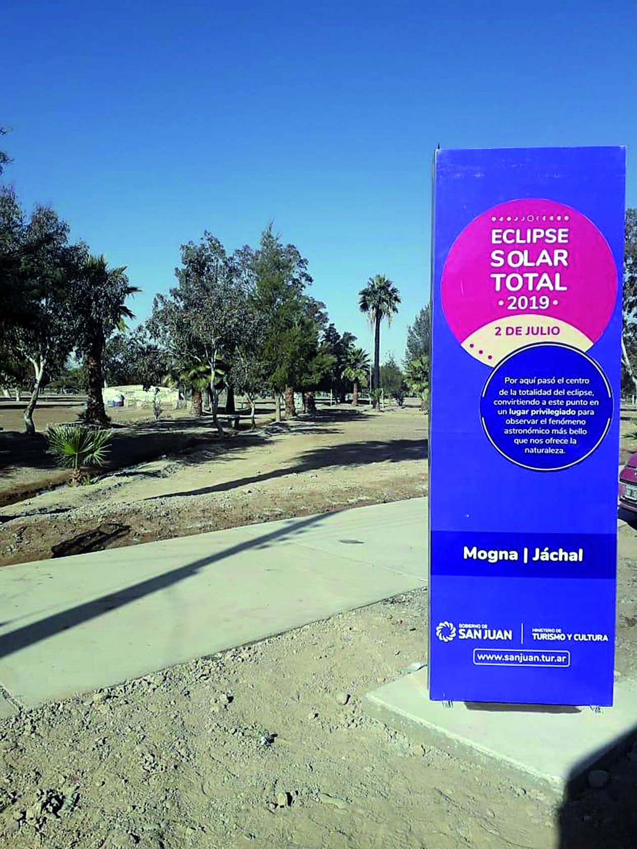 El funcionario contó que estos hitos son carteles gigantes, de casi cuatro metros de altura por casi dos de ancho, realizados en una chapa resistente a las inclemencias del tiempo. "La idea es potenciar el turismo en las zonas donde se observó el eclipse solar total y hubo actividades. Es por eso que estos hitos van a estar en los lugares oficiales de observación y para que los turistas que visiten San Juan por el eclipse, o posteriormente, puedan tomarse fotos junto a estos hitos. Es una manera de fomentar el turismo astronómico en la provincia’, dijo Juárez.
