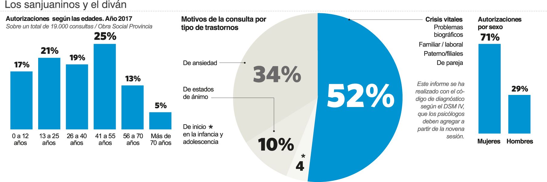 Scaliter indicó que estas consultas no están relacionadas a un trastorno mental, sino a las distintas etapas de la vida y se las considera crisis vitales. Generalmente la primera aparece en la adolescencia, cuando empiezan los cuestionamientos al entorno. Según las edades, en San Juan el segundo grupo que más recurre a la terapia es el que comprende de los 13 a los 26 años, con el 21 por ciento de las 19.000 consultas.