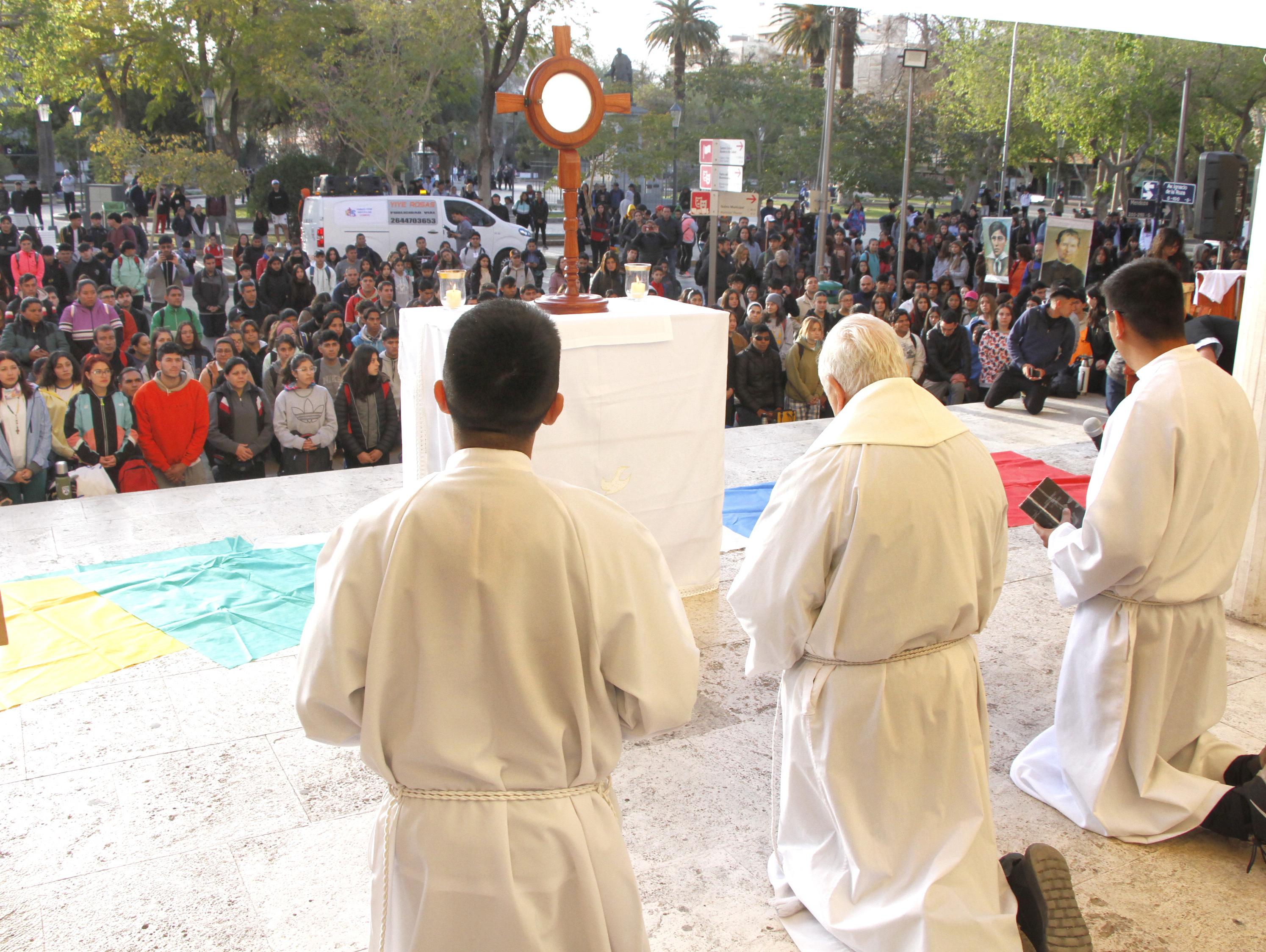 Monseñor Lozano salió del templo portando la imagen del Santísimo que colocó en un pequeño altar para vivir un momento de adoración. Y en este marco, los jóvenes se arrodillaron pidiendo por diferentes intenciones, entre ellas, que Dios bendijera a los que más sufren, aquellos que están enfermos, que los afecta la pobreza o que perdieron un ser querido.