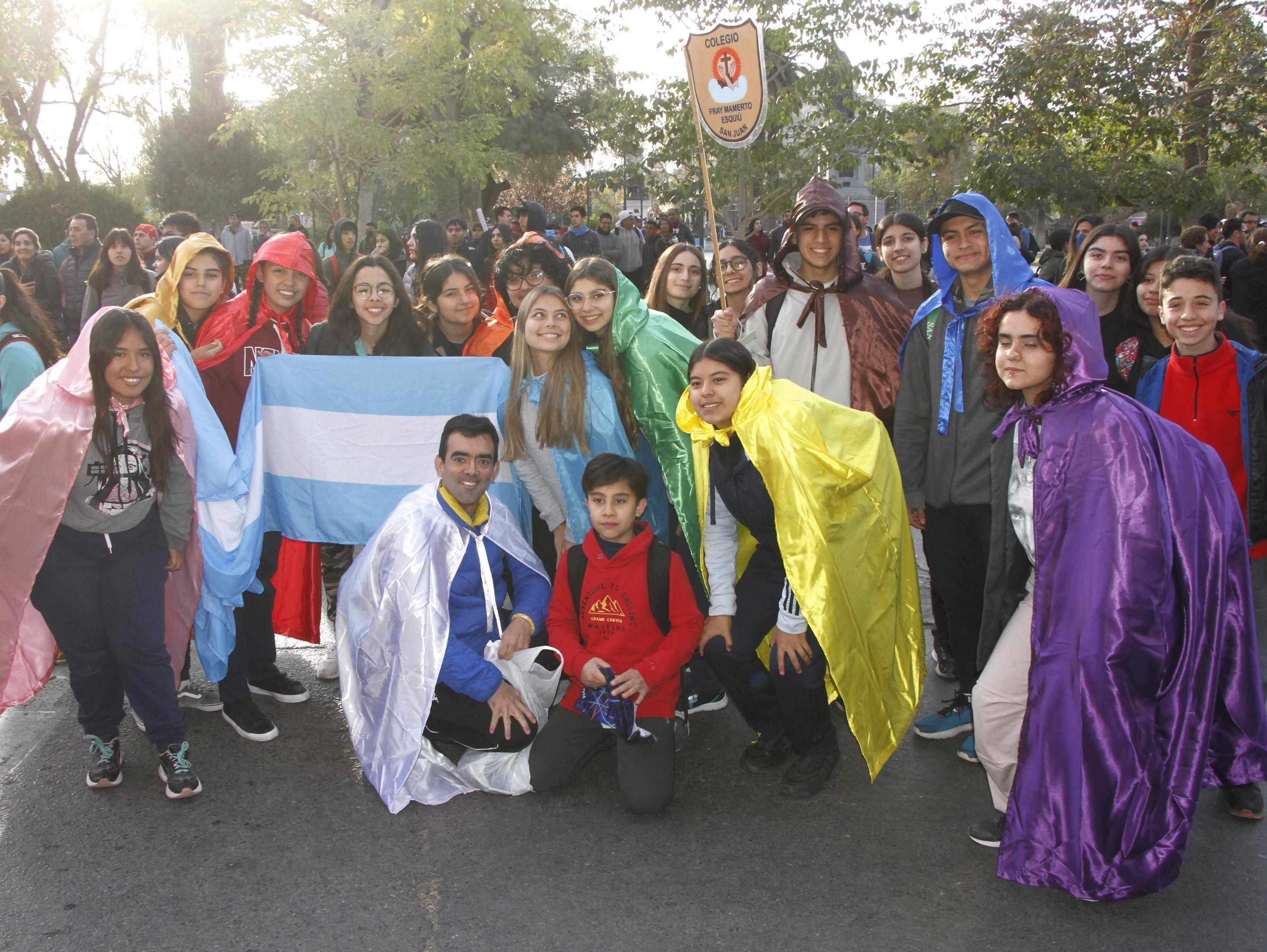 Alumnos de 1er a 6to años y profesores del Colegio Fray Mamerto Squiú peregrinaron luciendo capas de diferentes colores que simbolizaron el hábito franciscano. Además, cada uno de los colores representó un santo diferente.