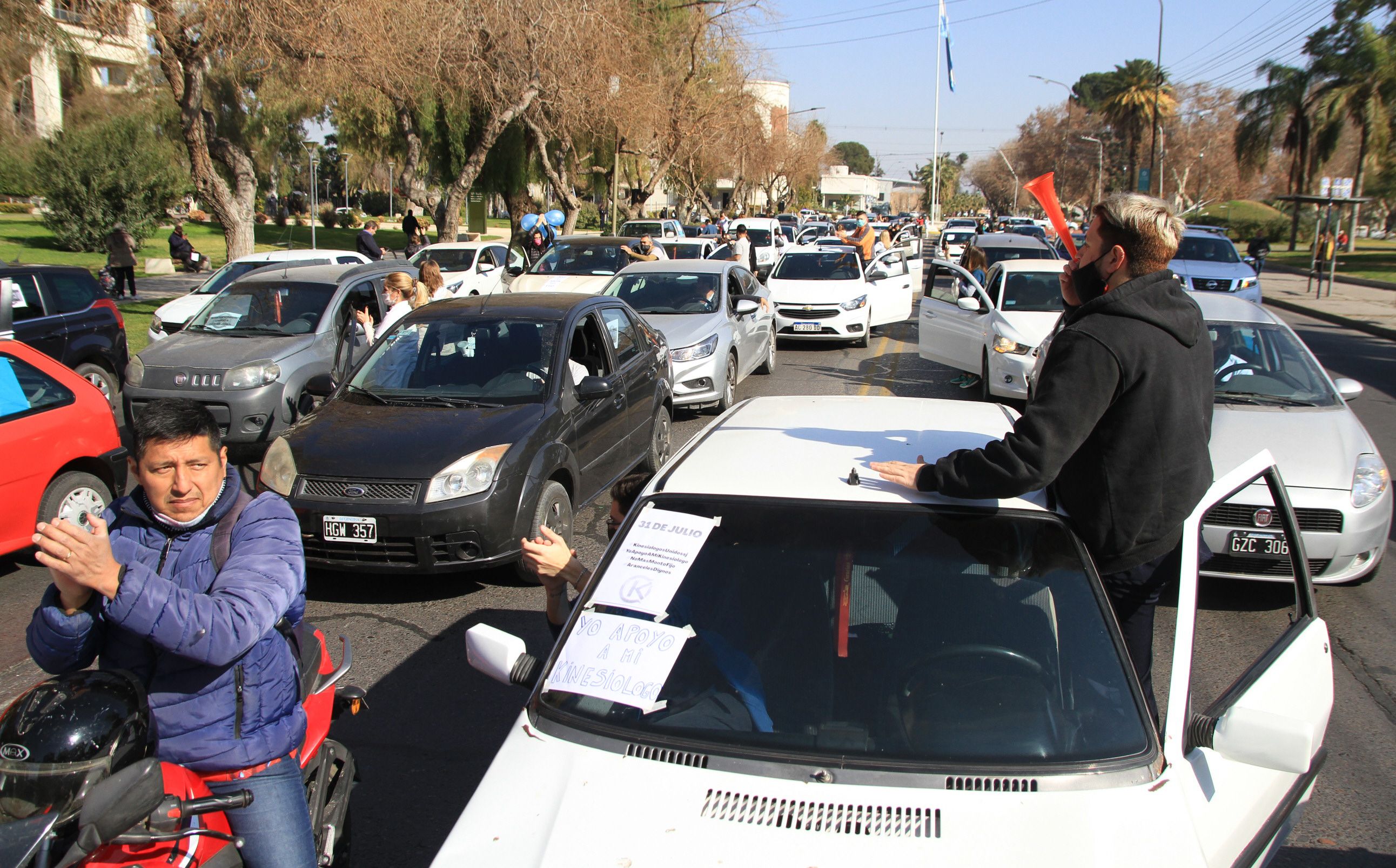 Desde antes de las 11 más de 300 personas se juntaron en las inmediaciones de Scalabrini Ortiz y Circunvalación. Con los autos llenos de carteles, banderas argentinas, globos y hasta cornetas el grupo Kinesiólogos Unidos de San Juan encabezó una caravana, que tuvo más de 7 cuadras de larga, y que tuvo el objetivo de que la comunidad y las autoridades de Salud Pública escucharan su reclamo. A los bocinazos y mostrando su descontento con los aranceles que paga la Obra Social Provincia y con la falta de espacios en la Salud Pública, entre otras cosas (ver aparte), los profesionales coparon las calles durante una protesta que duró más de 2 horas.