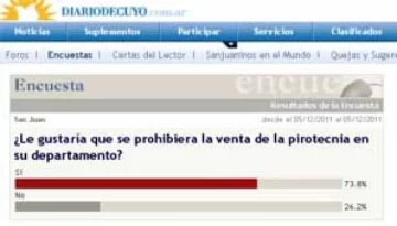 Al respecto, DIARIO DE CUYO ONLINE publicó una encuesta para conocer el punto de vista de sus lectores. La consigna fue la siguiente: ¿Le gustaría que se prohibiera la venta de la pirotecnia en su departamento? De 738 personas que votaron, el 73,8% votó la opción Sí, en referencia a que están de acuerdo con la prohibición de pirotecnia.