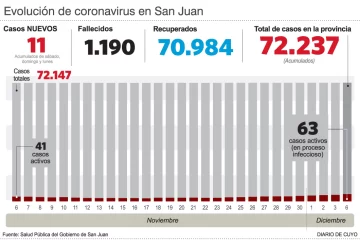 Por otro lado, entre sábado y ayer hubo 11 nuevos casos, detectados entre más de 380 test, y el acumulado ahora tiene 72.237 infectados. De ellos, los casos activos son 63 y los internados suman 37, de los cuales 14 están en terapia intensiva (hay 5 con asistencia respiratoria mecánica).