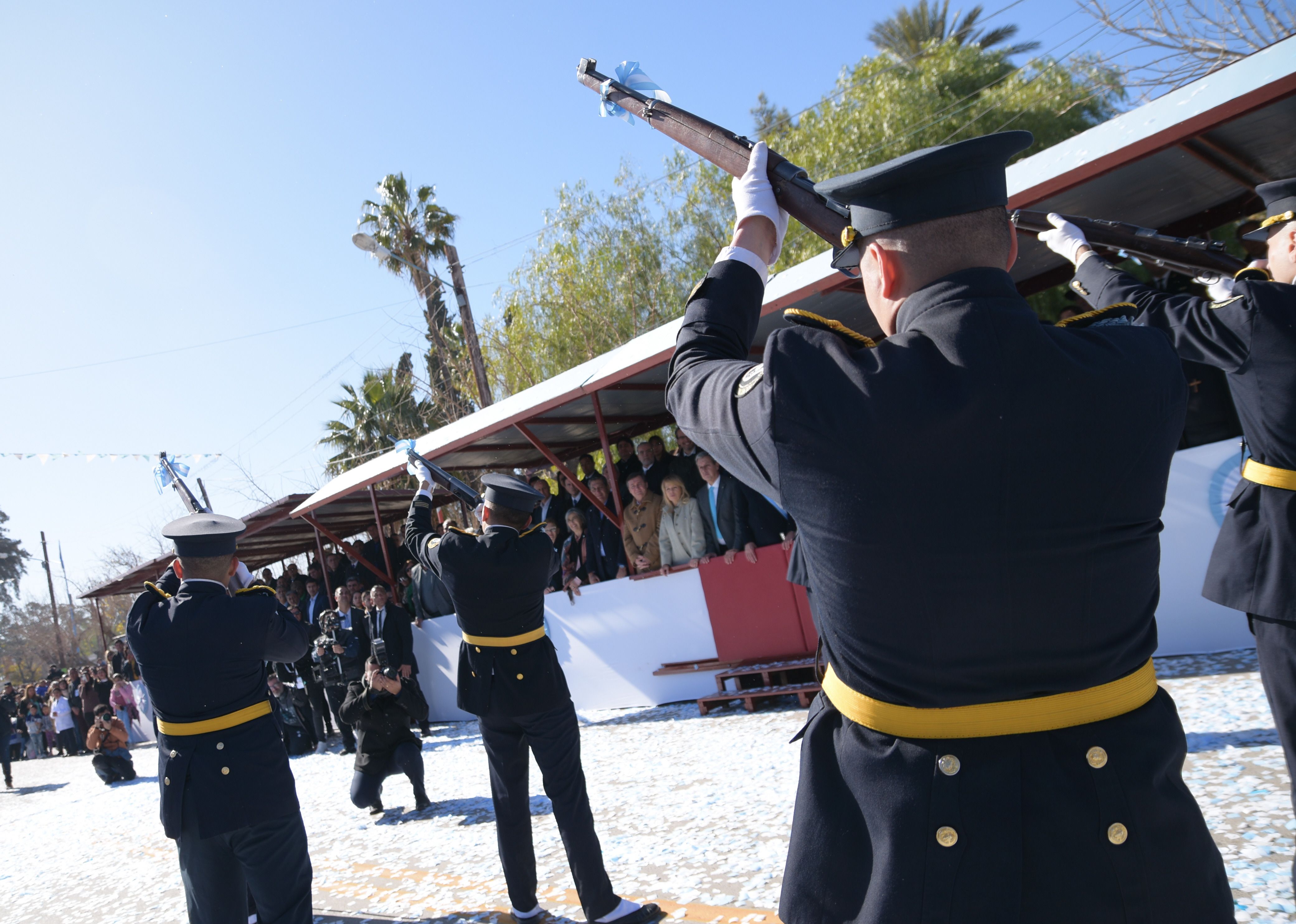Además, los niños disfrutaron de un hecho inesperado. Aplaudieron y gritaron de alegría cuando un grupo de efectivos policiales paró frente al palco para hacer una coreografía con sus armas. Terminaron su actuación con un disparo al aire.
