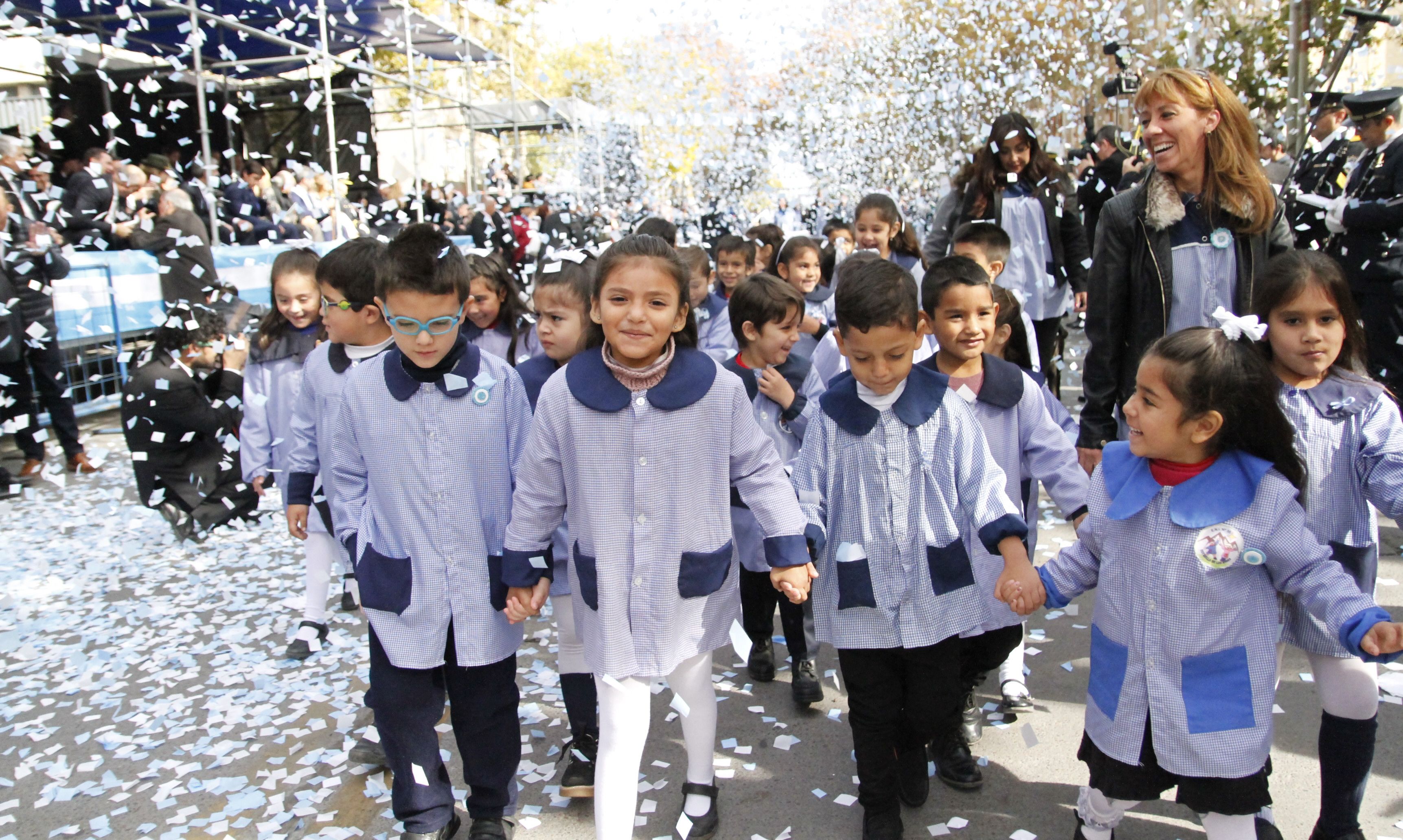 La emoción fue la primera sensación que explotó en el desfile. Fue cuando hicieron su paso los niños de la Escuela de Educación Especial Merceditas de San Martín, agarrados de las manos de sus maestras para no perder el paso. La gente los aplaudió de pie para alentarlos a continuar con la marcha. También ovacionó a los chicos del ENI 1 que saltaron de alegría cuando quedaron cubiertos de papeles albiceleste al pasar frente al palco.