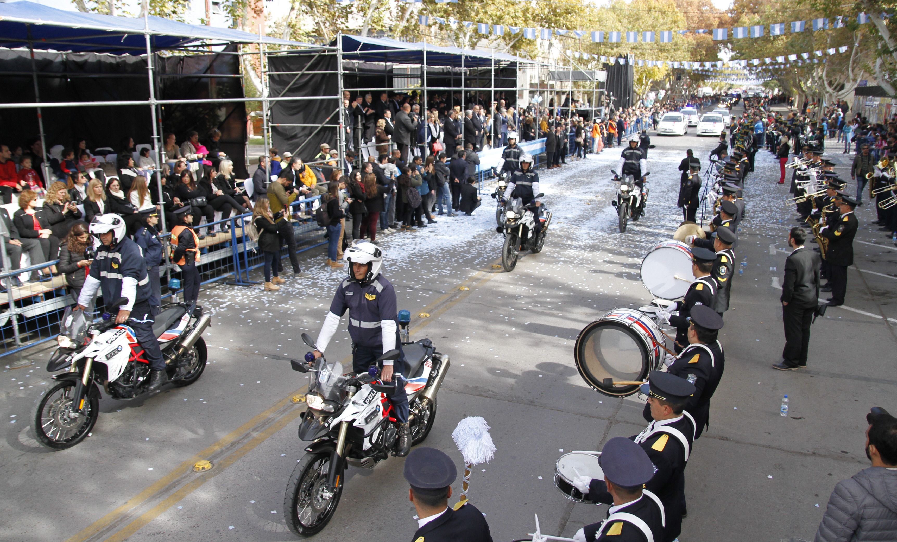 Los miembros de todas las Fuerzas Armadas y de Seguridad de la provincia también recibieron la ovación del público durante el desfile patrio. Cada una mostró todas las divisiones que la conforman y el parque automotor especial destinado a garantizar la seguridad y asistencia al ciudadano.