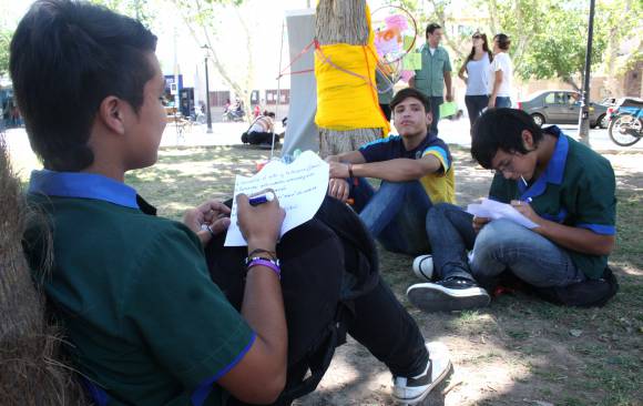Para eso, se colocó dos atrapasueños gigantes formados por una red de colores en uno de los árboles del espacio verde. Y se invitó a participar a todos los niños y adolescentes que pasaban por el lugar. Los más pequeños dibujaron sentados sobre el suelo y luego sus mamás escribieron sus pedidos. Mientras que los más grandes eligieron acomodarse en el pasto y hasta se pusieron a discutir qué escribir, como fue el caso de un grupo de alumnos de entre 14 y 16 años de la EPET Nro 3, quienes pasaron un rato hablando sobre cuáles son sus necesidades.